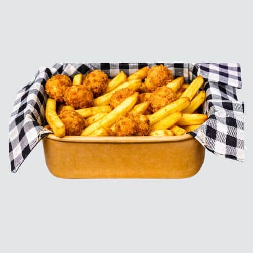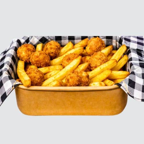 Popcorn Chicken served with Chips and Roasted Garlic Aioli